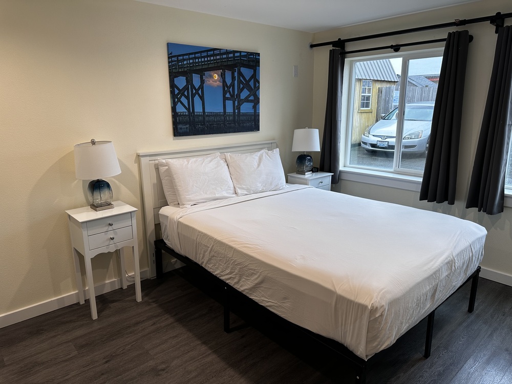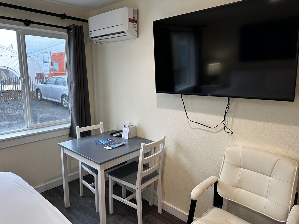 - Bedroom with queen bed, 40" TV, chair, alarm clock